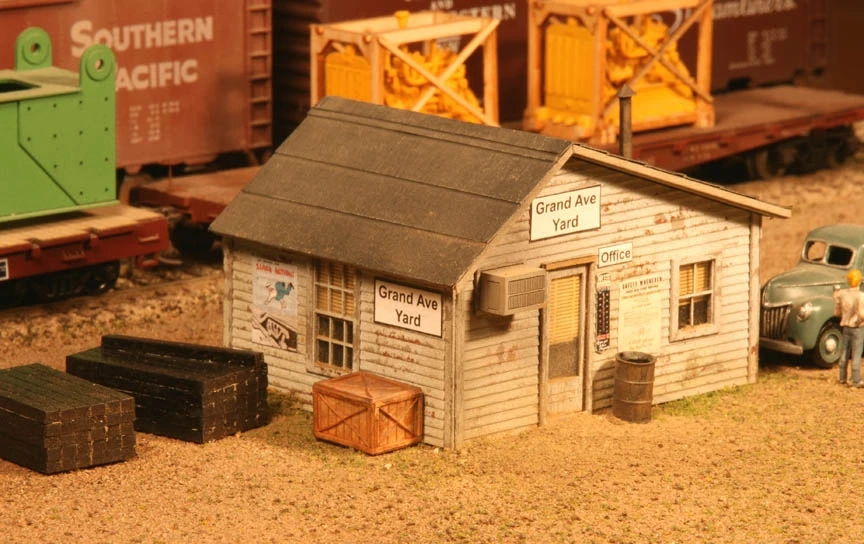 Kit features 100% laser-cut components for a perfect fit plus Tabbed and Slotted construction with Peel and Stick windows, doors, trim, and roofing material for fast assembly. The Yard Office includes some great details too: resin cast parts, such as tie stacks, wood crate, trash barrel, window air conditioning unit, and smokejack, plus our exclusive laser-cut venetian blinds for both entry door and windows, and full custom printed color signage.
