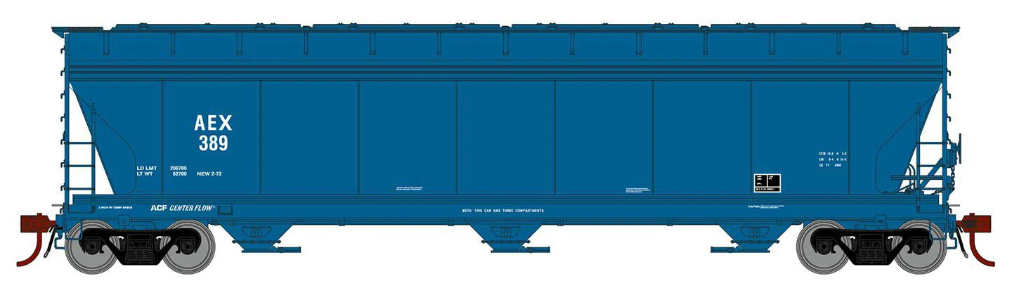 Our 3-bay car represents the common 4600 cu.ft. capacity version. The railroads looking to replace their aging 40′ box cars in grain service needed a modern hopper design – one that could operate within the tighter Plate B clearances for light branchline and industrial service. ACF’s design won them many contracts from a plethora of railroads. One can find these cars still in revenue service today in grain trains and other similar service.