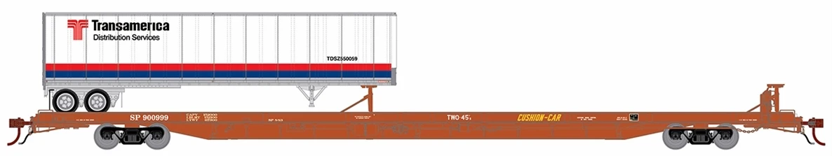 It wasn’t unusual for these cars to see several different loading configurations throughout their careers, to meet the changing needs of shippers. In service with Trailer Train, the three or four-letter reporting marks indicated the cars’ intended service and corresponding equipment. For example, an “XTTX” car was equipped with four collapsible hitches, capable of carrying various combinations of 28′, 40′, or 45′ trailers. A car in the “RTTX” configuration featured a pair of fixed hitches at the ends, and a retractable hitch amidships, allowing it to carry a pair of long (up to 45′) trailers back-to-back, or three 28′ “pup” trailers.