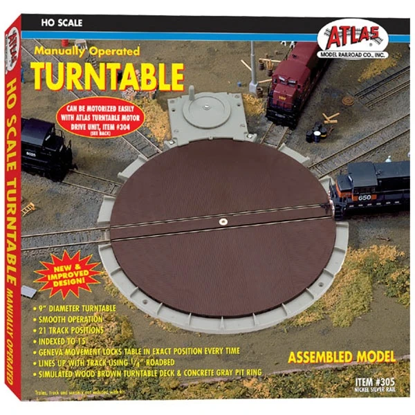 Simulated wood brown turntable deck and concrete pit ring. Surface mount; no cutting necessary. Manual crank operation; can be easily motorized for remote control operation with the #304 Turntable Motor Drive Unit.