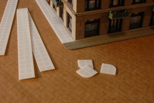 Ten straight (1/2″ x 5″) and ten corner (1/2″ x 1/2″) sidewalk pieces. Includes engraved lines for the sidewalks and the curb.