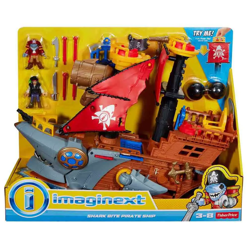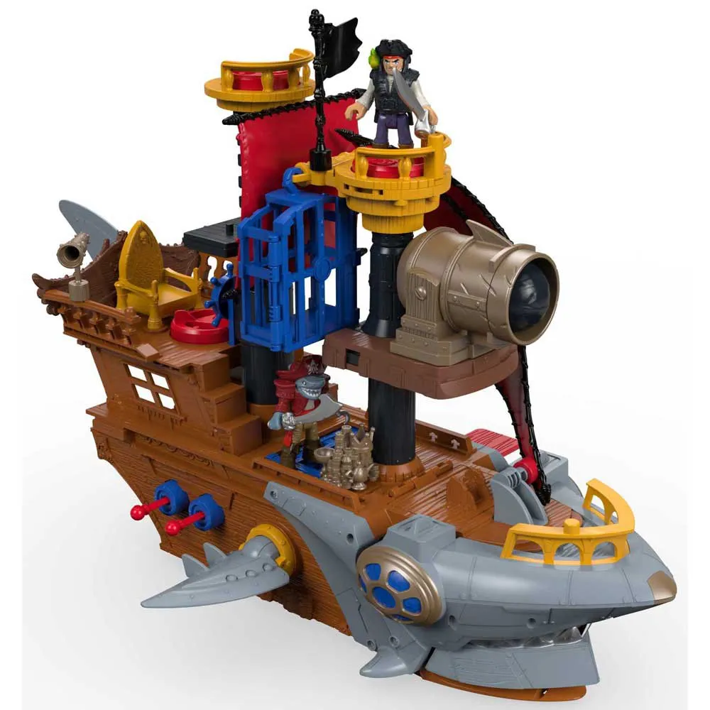 To protect your treasure from Blackbeard and his raiders, push on a Power Pad to capture attackers in one BIG shark bite! Still more coming? Turn another Power Pad to aim the cannon and fire – or push button on launcher to send projectiles flying! Now it´s all hands on deck for more high-seas adventures! Young buccaneers can throw prisoners in the brig that opens & closes … have them walk the plank … or hang ‘em from the yardarm.
