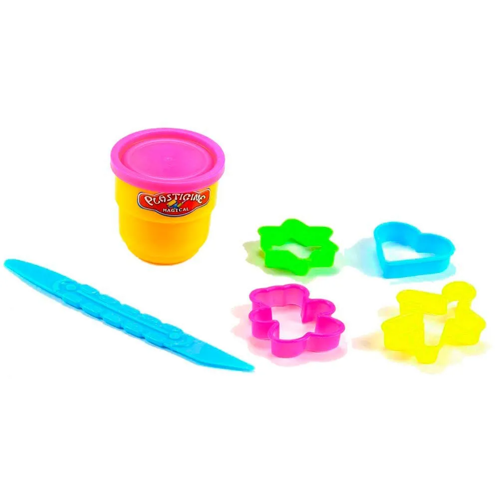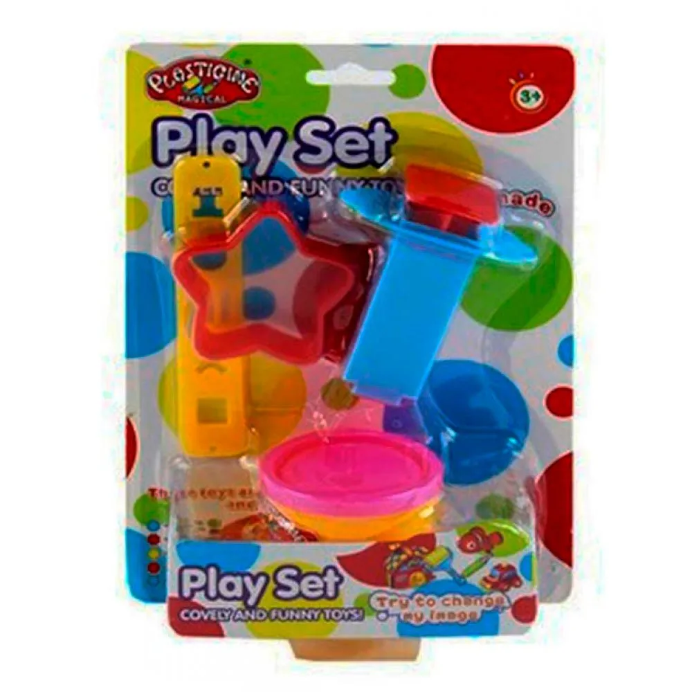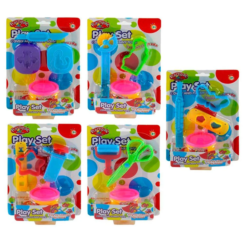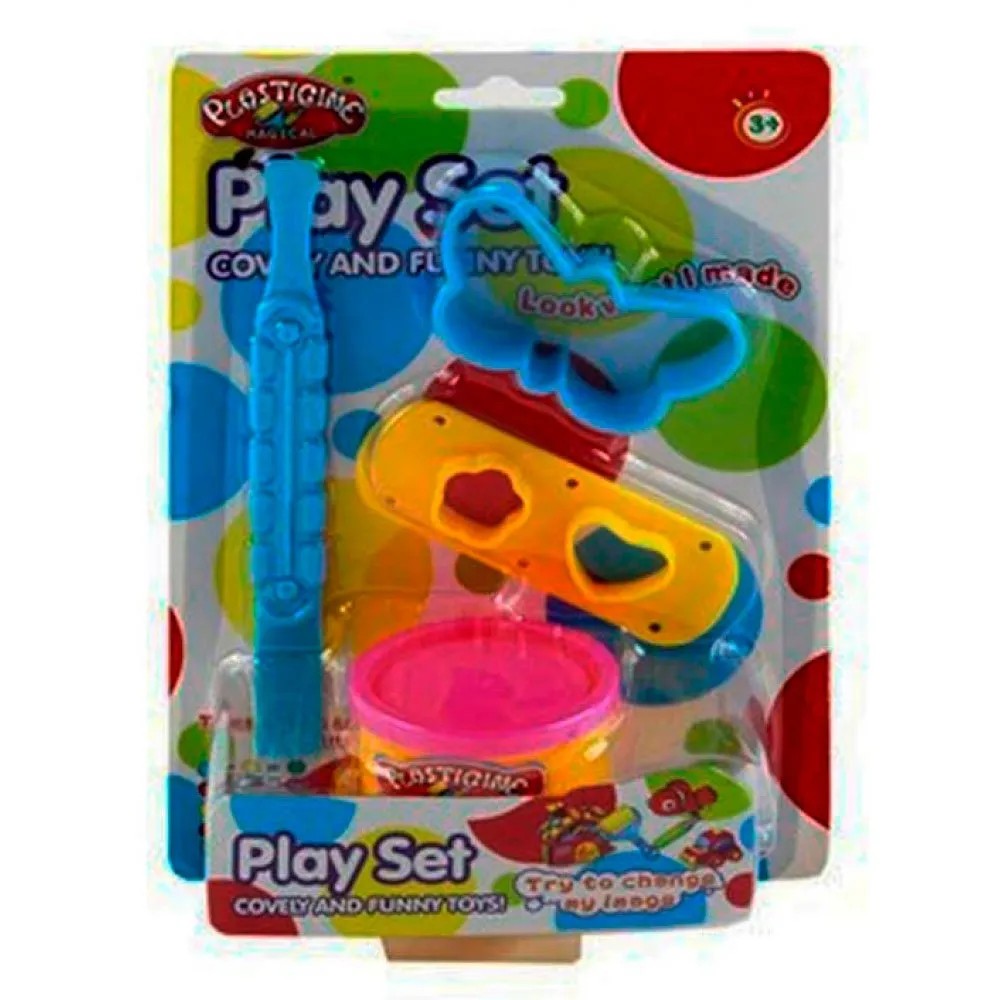Modeling set that includes a color plasticine boat and several accessories such as molds, spatula, scissors, etc.