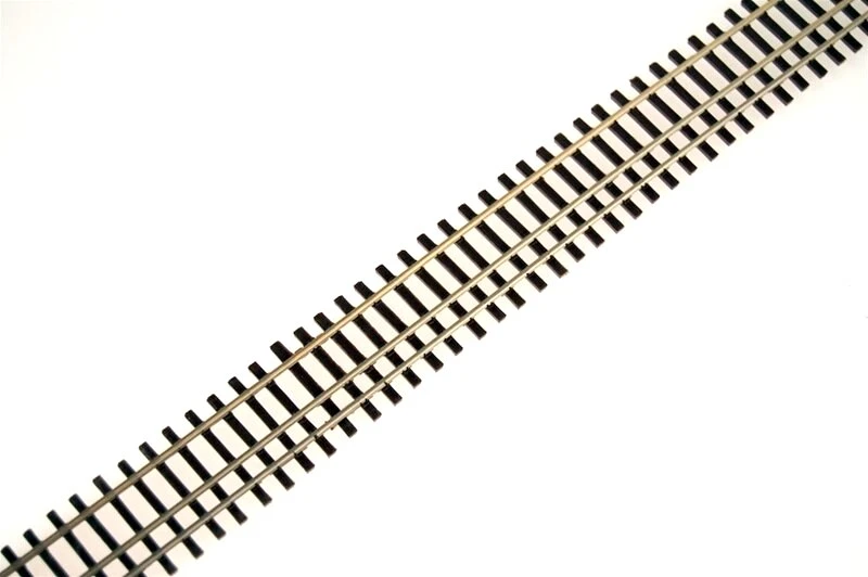 Non-weathered track has a natural brown tie color and nickel-silver rail in 3′ lengths.