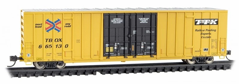 Built by National Steel Car in early 2003 for Railbox, a TTX subsidiary, these 286,000-pound capacity 60′ rib-side high-cube boxcars feature double-plug doors and belong to a series of 500 cars. Commonly called “TBOX cars” in reference to the reporting mark, they have a 7,538 cubic-foot capacity and can be found in trains hauling general freight all-across North America. Our model features separate end ladders, door hardware, brake rod, cut lever, etched-metal brake platform, body-mounted couplers and 36″ metal wheels.