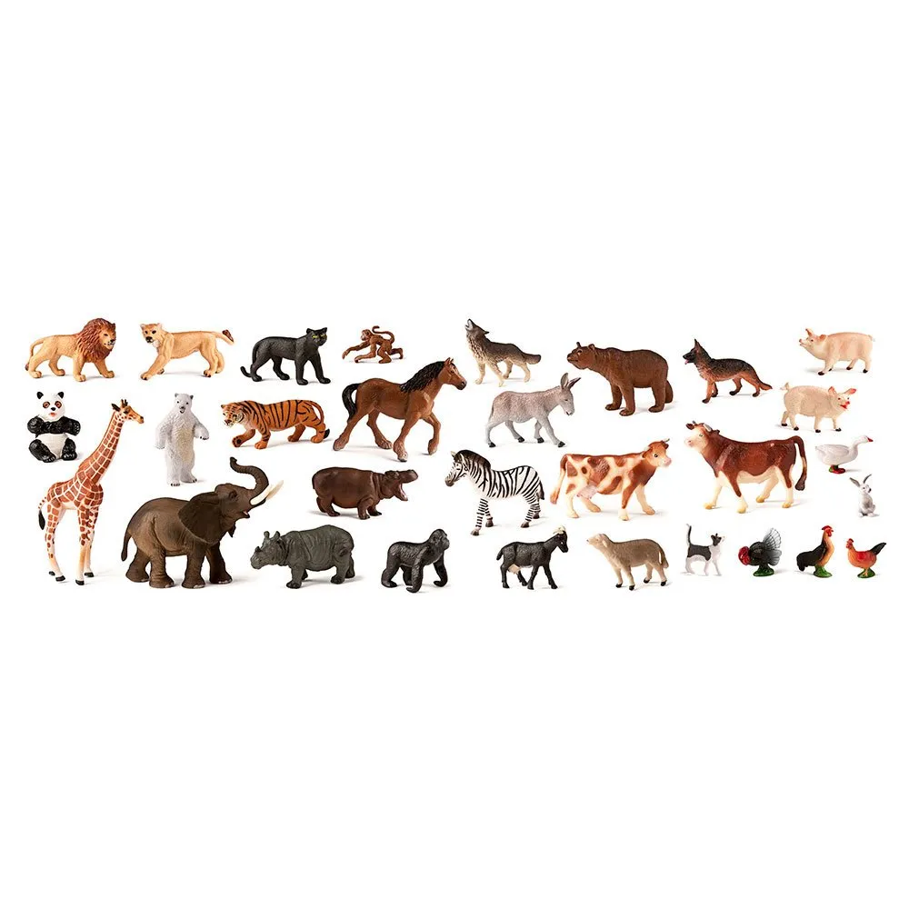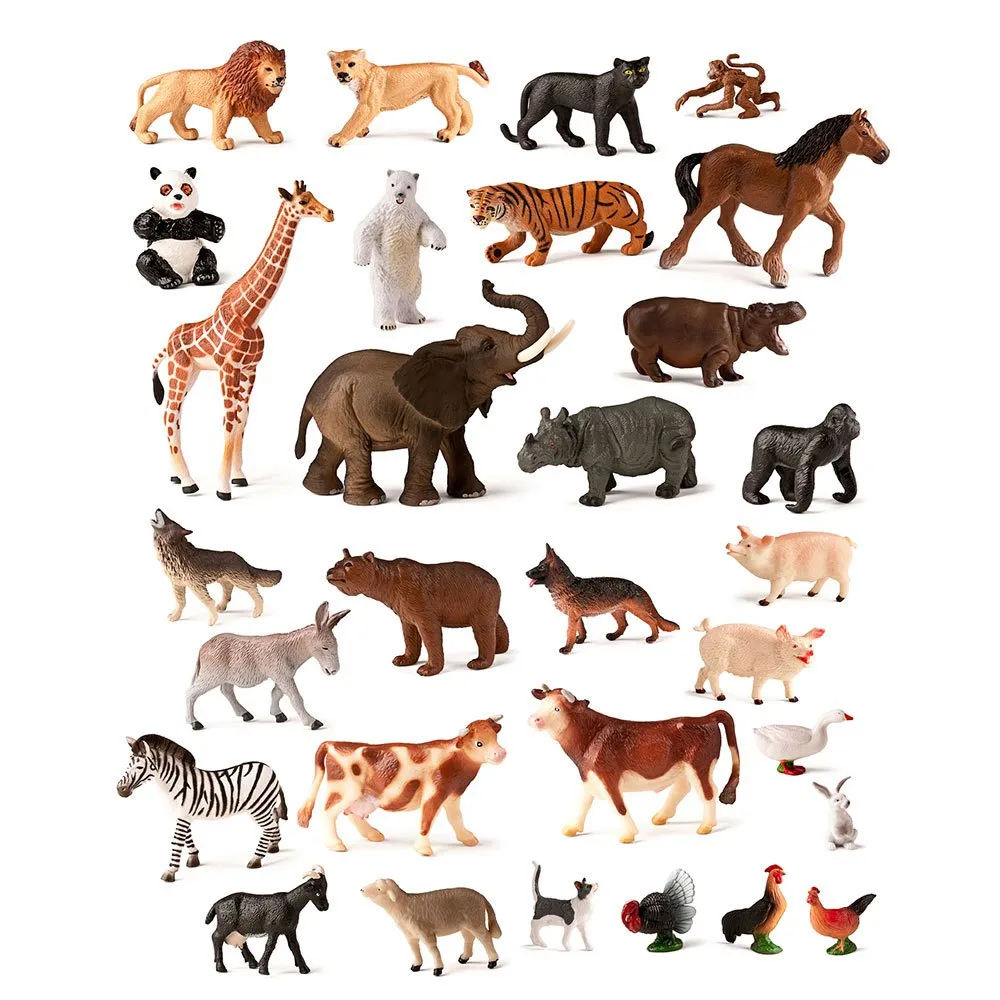 Lion, lioness, panda bear, polar bear, giraffe, elephant, panther, tiger, rhino, hippo, monkey, horse, gorilla, wolf, zebra, donkey, goat, lamb, grizzly bear, cow, bull, dog, pig, sow, goose, rabbit, rooster, chicken, turkey, cat & 1 teaching guide.