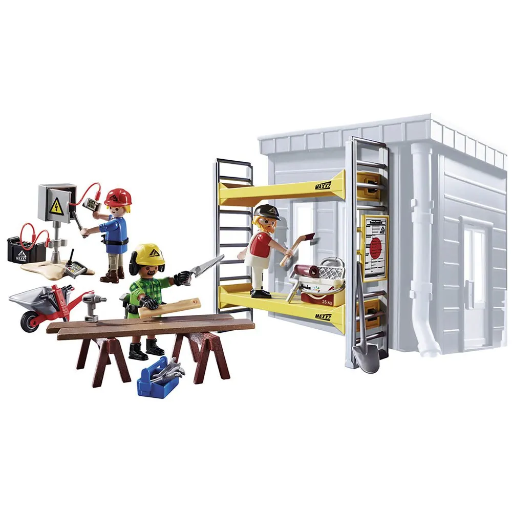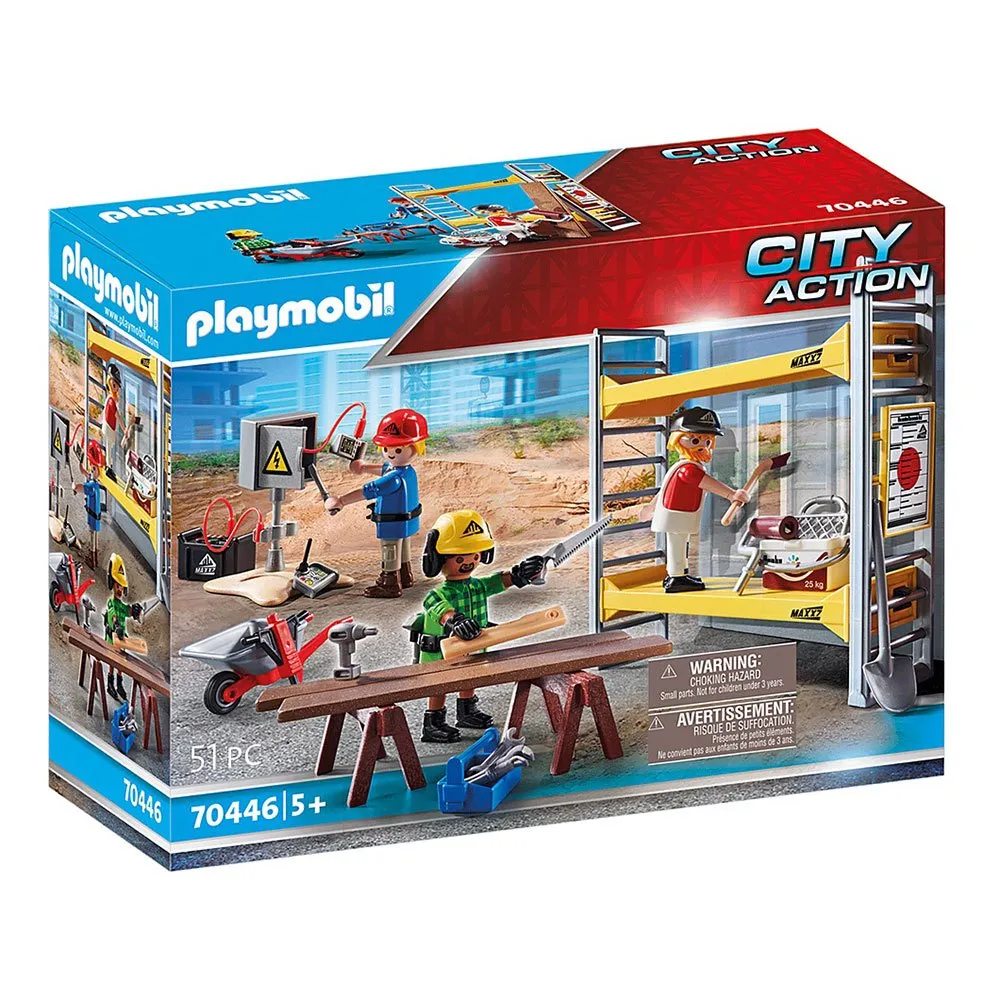 – Set includes three figures, tool box, wooden workstation, wheelbarrow, jack hammer, scaffolding, and many other accessories.