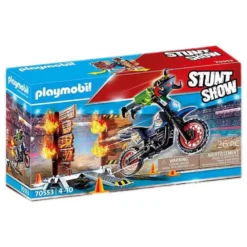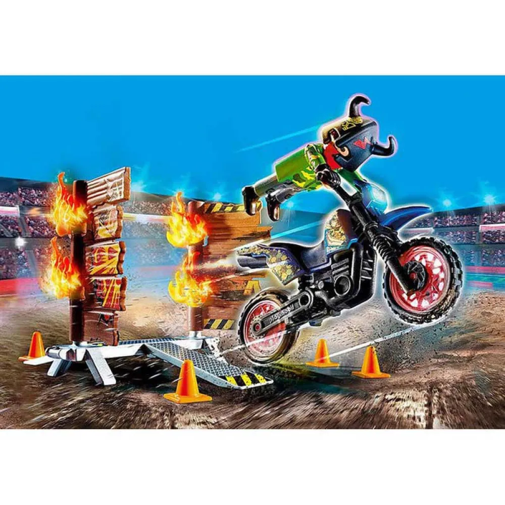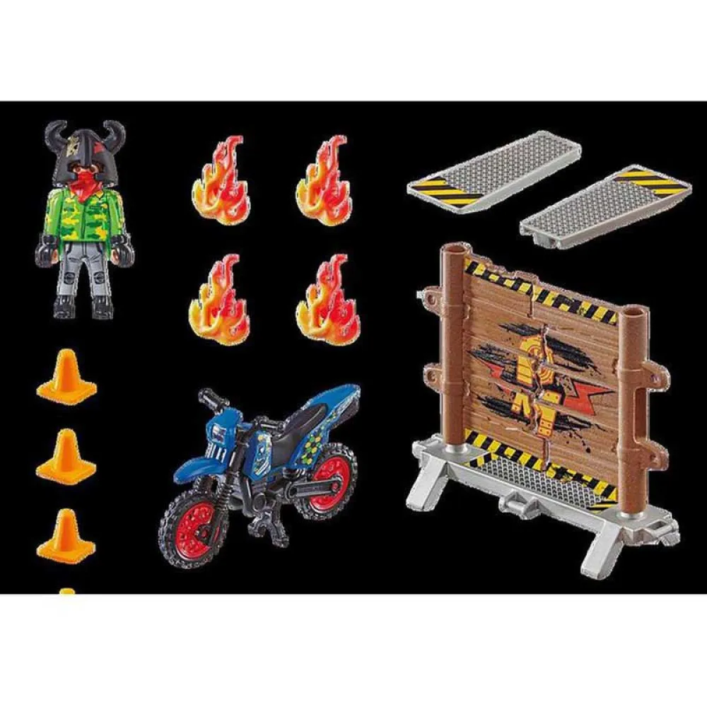 When it comes to spectacular stunts, the motorcyclist is in no way inferior to the heavyweights. The intrepid adrenaline junkie does not shy away from any challenge. At full speed, he races over a ramp directly towards the fiery wall and with verve shoots right through the middle. This stunt rider fears neither flames nor speed. This is not for the faint-hearted! The set contains a PLAYMOBIL motorcyclist, a motorcycle including ski jump and variable board wall, helmet, gloves, scarf and other extras.
