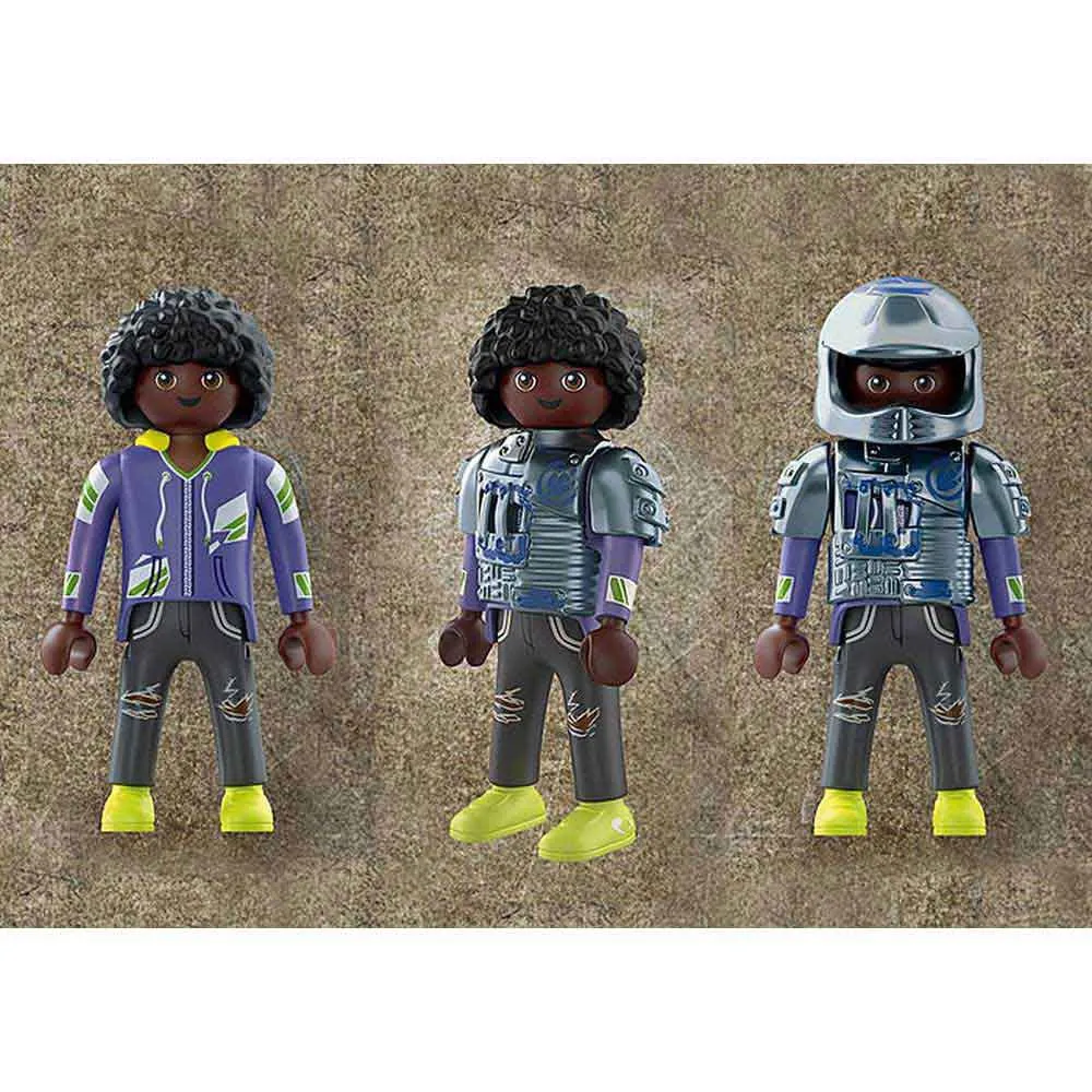 – Figures: 1 teenager, 1 villain; Accessories: 1 triceratops, 1 back armor, 2 fire projectiles, 1 projectile gray, 1 net, 1 box, 4 energy stones, 1 mini-robot, 1 grapple, 1 hose, 2 helmets, 1 pair of arm cuffs, 1 chest armor, 1 pair of arm guards, 1 bandana, 1 change wig