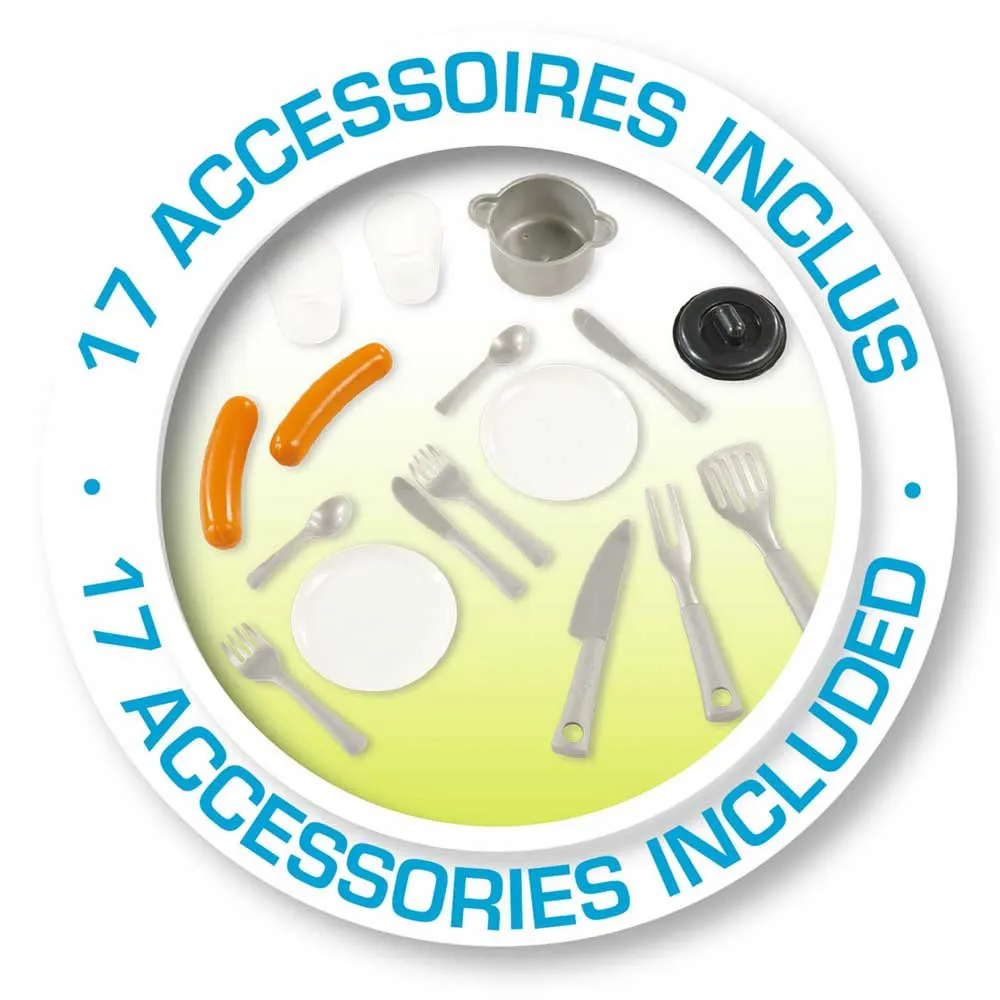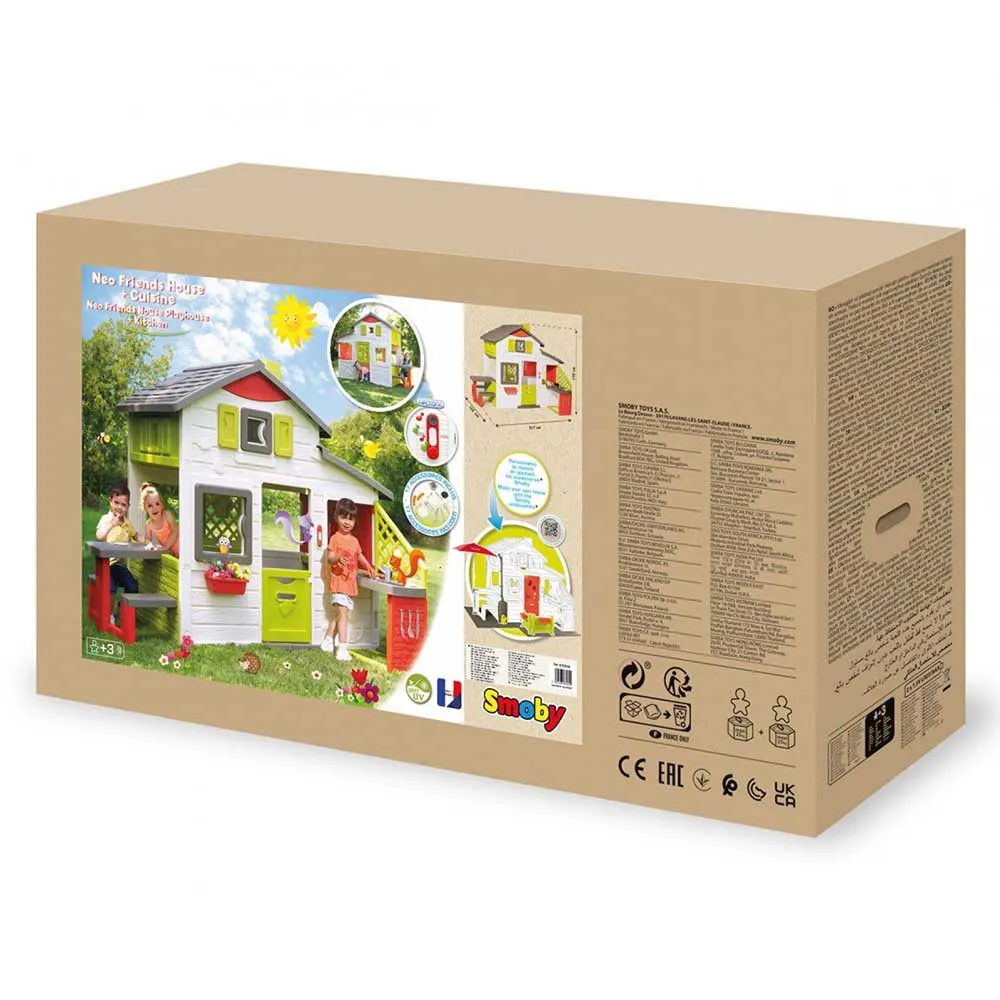 Complete and spacious, the Neo Friends House + kitchen playhouse gives your children a lot of game possibilities! They will be able to invite their friends to share many good times! They will just have to use the electronic doorbell to signal their presence! With its height (1.72m) and its anti-UV treated plastic imitating stone and wood, this playhouse has everything of a contemporary house. It is perfect to behave like parents and to imagine living in a big house! With its different game spaces, your children will eat in the picnic area, garden, and cook thanks to the “grill” and the different accessories included (glasses, plates, cutlery, stew pot, sausages…). This hut, including 2 half doors, 6 windows, 2 pivoting shutters (360°), a removable picnic table with its 2 benches, will enable your children to imagine thousand different stories and situations!
