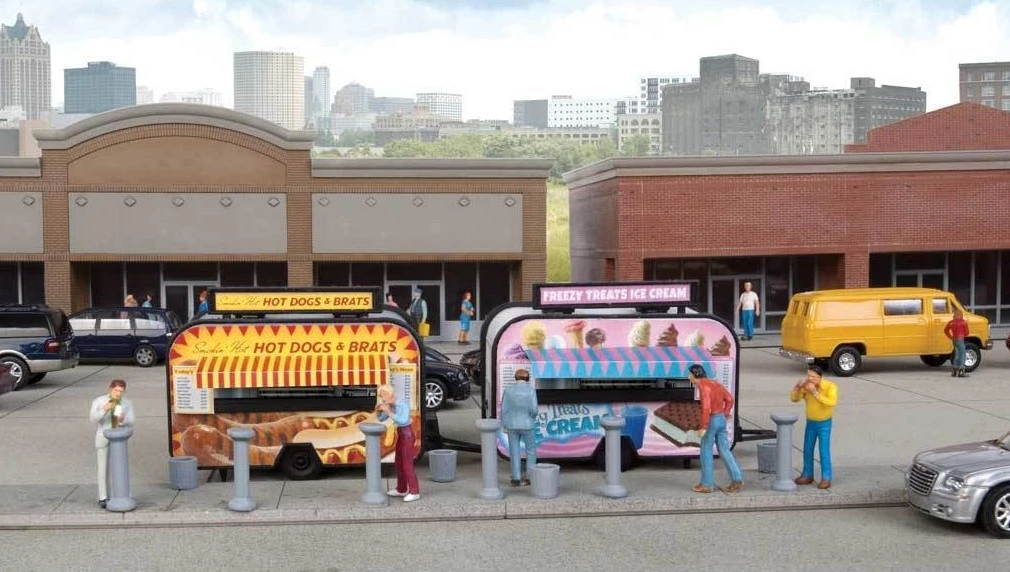 Include parts for two trailers with printed signs, awnings and interiors in full color, along with stand-up tables and wastebaskets to detail the scene.