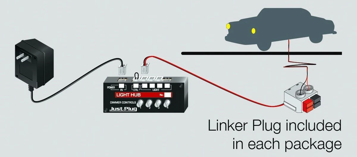 Just Plug Vehicles make it easy to model backcountry roads or busy city scenes. These vehicles add light and interest to layouts without the need for electrical knowledge, soldering, or wiring. With a driver and a set of headlights and taillights, your layout’s traffic has never looked so realistic. Add a Vehicle to a Just Plug Light Hub for easy installation, Just Plug and you’re done!